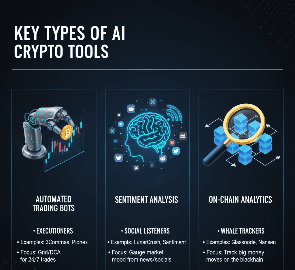 There are a few main categories of AI tools in crypto trading you need to know about. You don’t need all of them, but you need to understand which one fits your style.