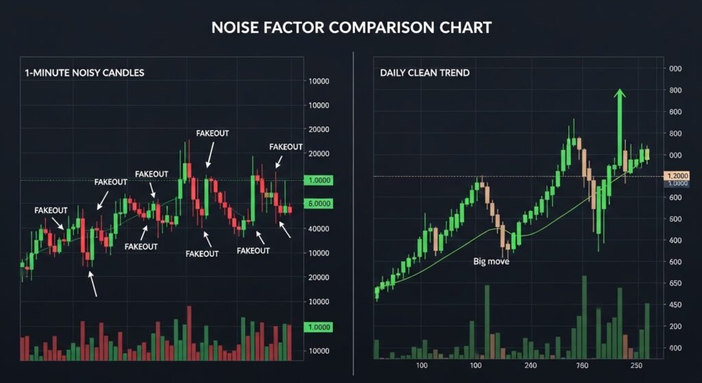 Here’s the thing. The lower the time frame, the more “fake outs” you get. If you’re hunting for the best time frame for trading in the forex market, you need to understand the concept of “Noise.”