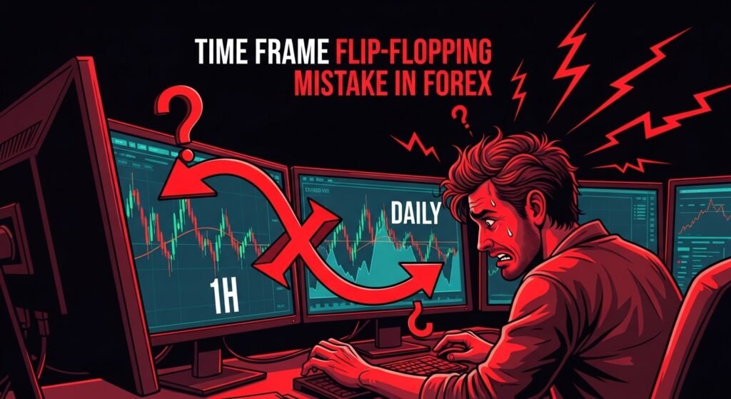 This is the most common emotional disaster. You enter a trade on the 15-minute chart. Price starts going against you. You get scared. Then you say, “Oh, I’ll just look at the 1-hour chart, it still looks bullish there.”