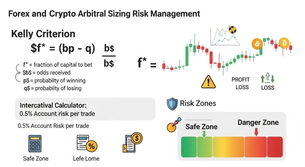 Risk 0.5-1% account. Say $10k acct, $50 risk. Gap 0.0005 (5 pips), stop 10 pips → size = risk / (stop * pip value). Lot size 0.5. Fees $6 deduct. Python: if (gap * size) > (fees + slippage): go. Blew sizing once—5% risk gone.