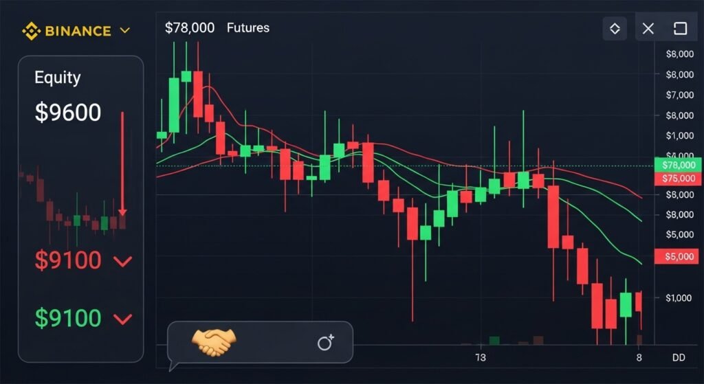 Account equity: roughly 9,600 USDT. Risk per trade: I thought it was around 2%, but I didn’t fully factor in slippage and volatility.